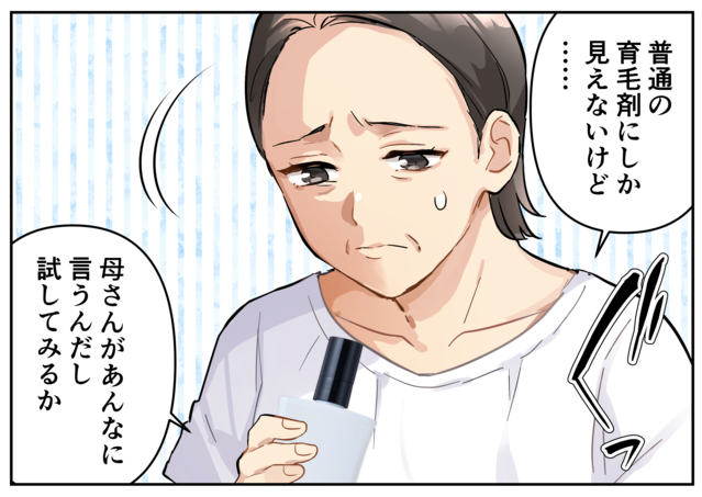 娘に薄毛を指摘されたことがショックで、育毛対策始めました。使い始めてすぐに「使い心地が…!」とすぐに感動しました。自宅に届くので、買うのも恥ずかしくないので始めてよかったです。